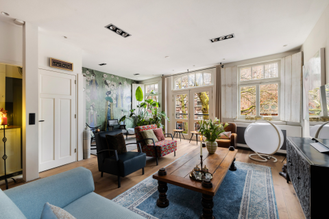2e verdieping: overloop met trappenhuis, grote, lichte woonkamer met open haard en openslaande deuren naar het dakterras. Aan de voorzijde een Frans balkon, uitzicht op de Nieuwstraat en de Hema.